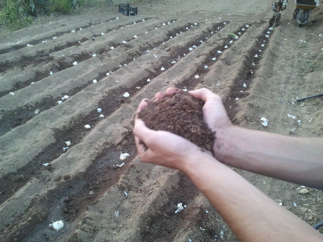 Como la tierra está ligeramente seca, regaremos bien el surco ya que las lluvias en este periodo han sido realmente escasas, y una vez regado todo el surco, hemos colocado las cebollas con la raíz hacia abajo y las hemos repartido unos 20cm de distancia para después calzarlos. No debemos cubrirlas con tierra, tienen que quedar en el surco y sin tierra que le cubra, será más adelante con el calzado. Nos han salido unas 200 cebollas. Así que si todo va bien dispondremos de un buen excedente de calçots. No os hemos comentado nada sobre el abono de la tierra y es que esta vez hemos pensado que en vez de abonar la tierra con estiércol y removerla con el tractor o moto azada, hemos optado por una vez tenemos colocadas las cebollas esparcimos un poco de estiércol en el espacio entremedio y a esperar a que crezcan los “grillos” para irlas calzándolas con la motoazada. Os iremos informando paso a paso de su evolución y del calzado de los calçots.